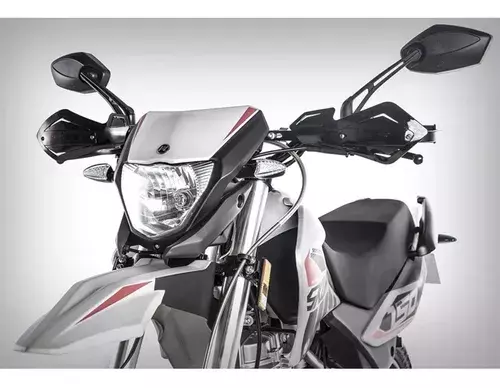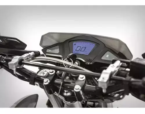 La suspensión delantera invertida y la trasera monoshock, junto con los frenos de disco en ambas ruedas, brindan estabilidad y seguridad en todo tipo de terrenos. Las llantas negras de rayos reforzados complementan la robustez y el estilo único de esta moto.